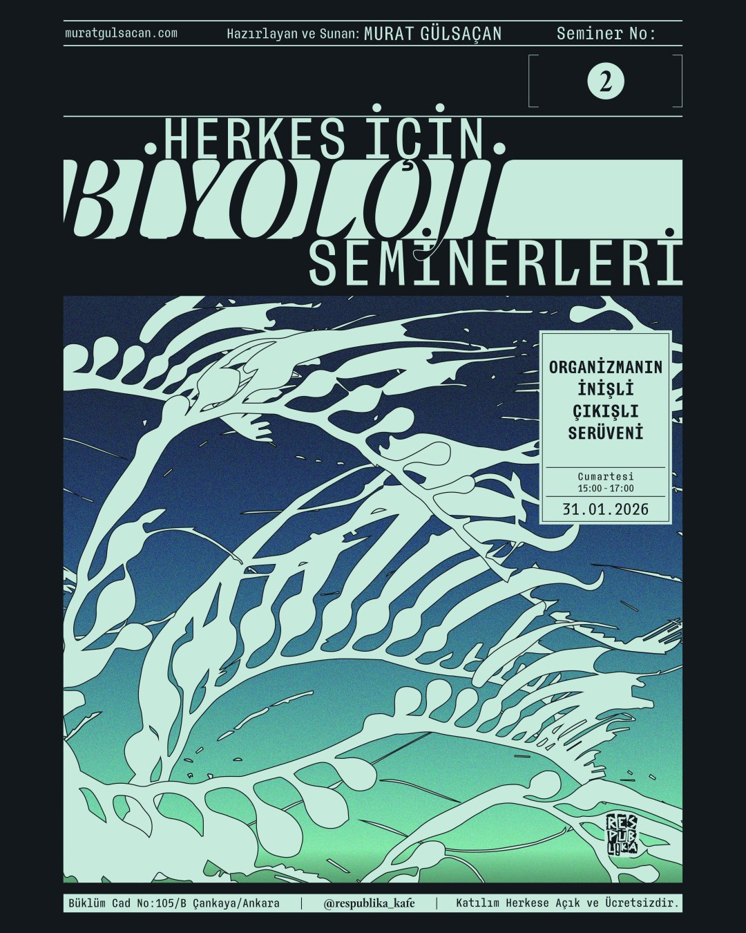 Herkes İçin Biyoloji seminerlerinin ikincisinde “organizma” kavramını felsefi ve tarihsel boyutlarıyla inceleyip ardından da günümüzdeki kullanımlarına bakacağız. HiB seminerlerinin ikincisi bugün (31 Ocak 2026) Respublika Kafe‘de saat 15:00’de. Afişimizi Ezgi Onur hazırladı.