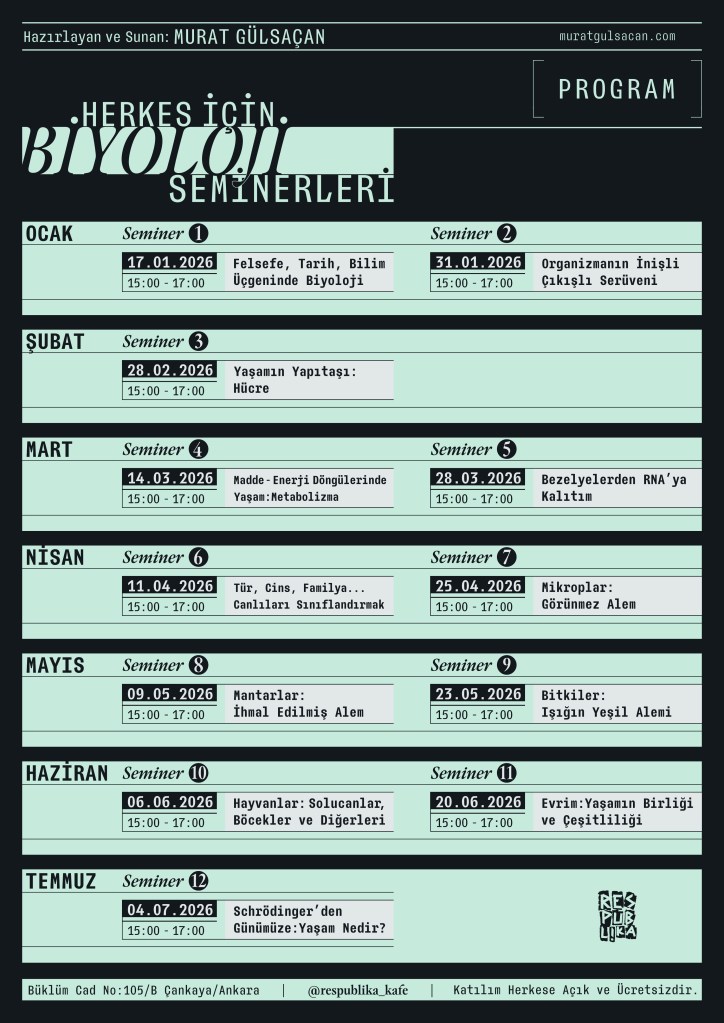 Herkes için Biyoloji (HiB) seminerleri Ocak 2026’da yüz yüze olarak Ankara’da başlayacak. Seminerleri Respublika Kafe‘de gerçekleştireceğiz, kendilerine açtıkları alan için teşekkürler. Bu seminerlerde yaşamın bilimi biyolojinin; organizma, kalıtım, hücre ve evrim gibi temel kavramlarını bilim, tarih ve felsefe üçgeninde irdeleyip, en sonunda esas soruya “Yaşam nedir?”e ulaşacağız. Seminerlerin ayrıntılı programı aşağıda. Görüşmek üzere.